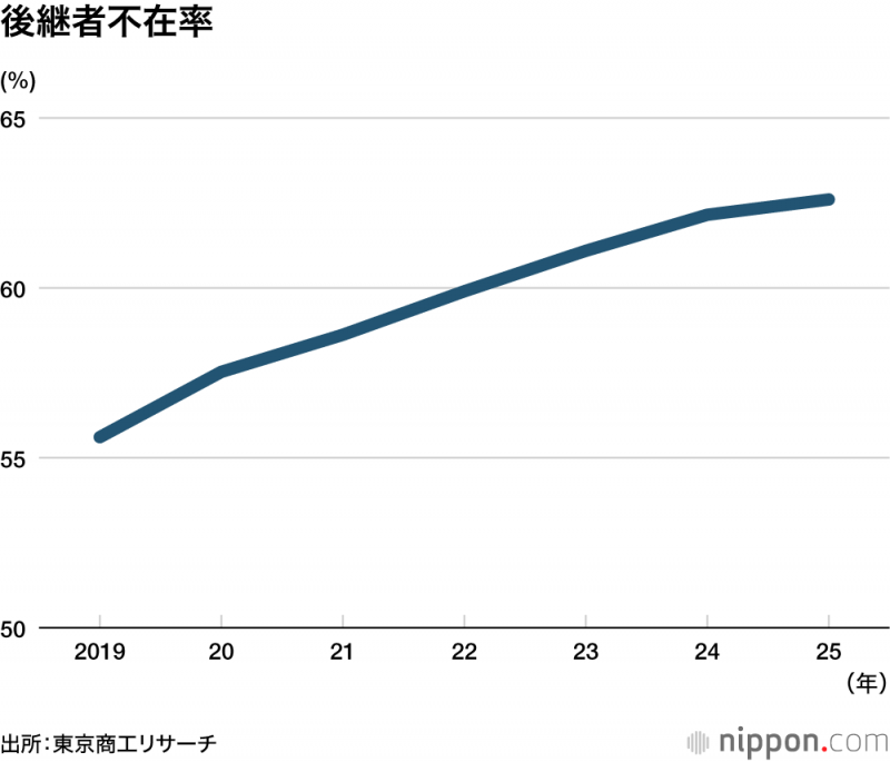 東京商工リサーチの調査で、全国の企業の後継者不在率は前年比0.45ポイント上昇の62.60%だった。同社の企業データベースから分析可能な約17万社を抽出して調べた。不在率は、調査を開始した2019年以降、毎年、上がり続けており、10産業別で6産業が60%超だった。