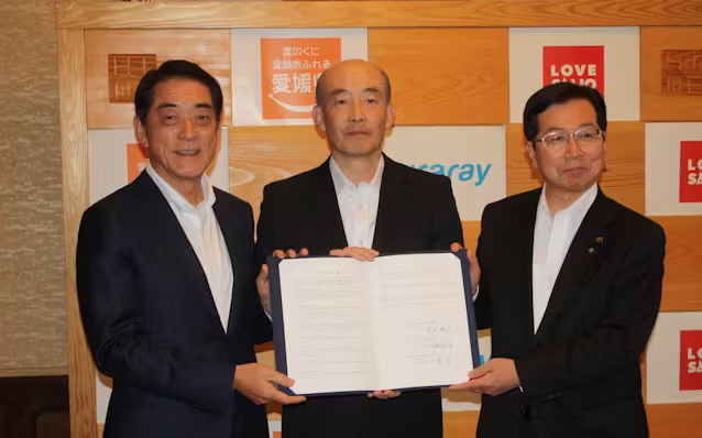 愛媛県庁で中村時広知事、西条市の高橋敏明市長、クラレの川原仁社長が出席して、立地協定書の調印式を開いた。中村知事は「この投資をきっかけに一段、二段と成長していくのは間違いない。県も全力でサポートしていく」と述べた。