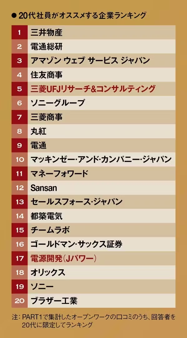 このうち、対象を20代社員に限定して上位20社をランキングしたのが下の表だ。おおむね全体ランキング上位の企業で占めているが、Jパワーは全体ランキングで100位圏外にもかかわらず17位に食い込んだ。