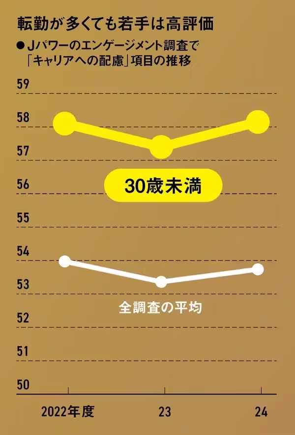 Jパワーは21年度から、従業員の意欲の高さを示す「従業員エンゲージメント指数(EEI)」を調べている。勤務する拠点や職種、年齢など属性ごとの課題を把握して、職場単位の改善につなげる狙いだ。人事部門や上司らによる手厚いケアが奏功し、30歳未満の社員はEEIの調査で「キャリアへの配慮」の項目が22年度以降、それ以外の年代の平均を大きく上回っているのだ。