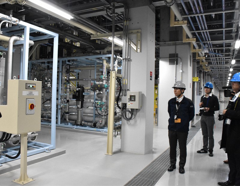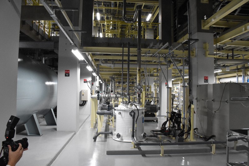 報道公開されたのは2024年12月に量産を開始した第1工場の地下2階(約2万2000平方メートル)にある設備。タンクが並び、配管が縦横に走る。担当者によると、くみ上げられた地下水はここで「超純水」に生まれ変わっている。水に含まれるミネラルなどを極限まで取り除いた水で、半導体製造には欠かせない。