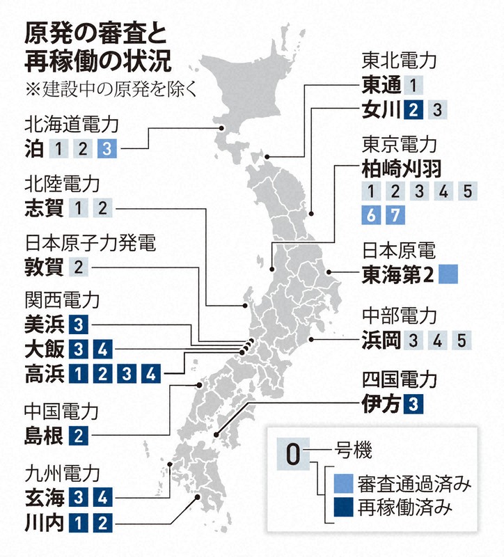 2011年3月の福島第1原発事故を受け、国内の全ての原発は運転を停止した。その後、原子力規制委員会の新規制基準に基づく安全審査に合格したのは、柏崎刈羽原発6、7号機を含めて18基。これまでにそのうち14基が地元自治体の同意を得て再稼働に至っている。