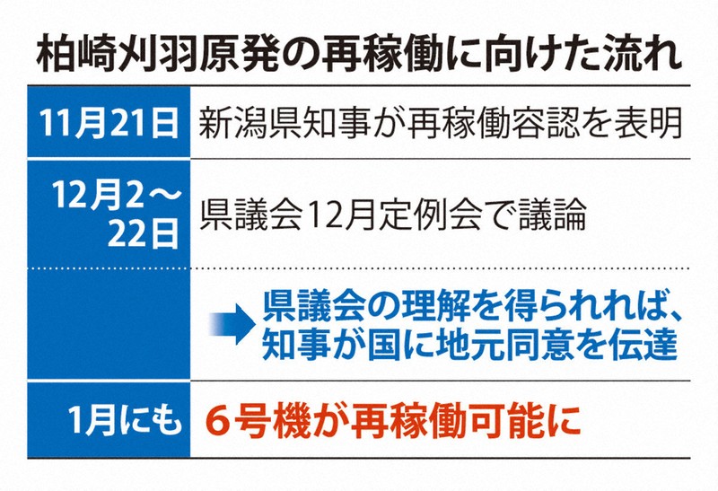 今後は補正予算案の議決により「県民の意思を確認」する段階に入る。知事与党会派の自民党が過半数を占める県議会での信任は決定的で、閉会日の12月22日以降、政府に再稼働容認を伝える見通しだ。関係者によると、その後の原子力規制委の確認が順調に進めば、1月中にも原子炉起動が可能な状態になる見通し。【木下訓明、神崎修一、戸田紗友莉、木許はるみ】
