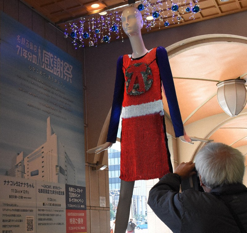感謝祭に合わせて巨大マネキン「ナナちゃん」も、布状のサイネージを使った新たな衣装になった。ナナちゃんの年齢にちなみ、過去650着以上の衣装からえりすぐった52着が次々に表示される。初の「リアルタイム早着替え」に、通行人らが足を止めていた。【酒井志帆】