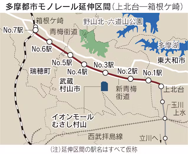 多摩都市モノレールの延伸を巡っては、国の交通政策審議会が16年に北側の上北台―箱根ケ崎間と南側の多摩センター―町田(町田市)間について「事業化に向けて具体的な調整を進めるべき」路線に位置づけた。