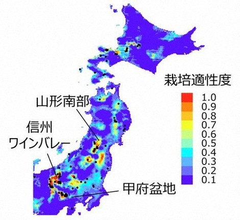 平賀助教によると、ワイン産地として有名なイタリアや米カリフォルニア州などでは21世紀末までに栽培に適さなくなる可能性があるとこれまでの研究で指摘されている。一方で、国内の栽培地の変化に関する分析は十分ではなかった。