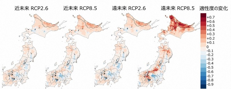 更に、「41~60年の近未来」と「81~2100年の遠未来」の二つの年代でそれぞれ、温暖化の程度が比較的抑えられた場合と比較的大きい場合を想定。計4パターンで適性度が現在からどう変わるのか予測した。