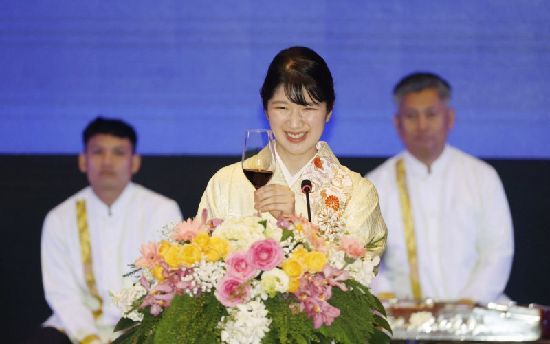 ラオスのパーニー国家副主席主催の晩さん会であいさつし、ラオス語で乾杯の発声をされる天皇、皇后両陛下の長女愛子さま=18日、ラオス・ビエンチャン市内のホテル[代表撮影]