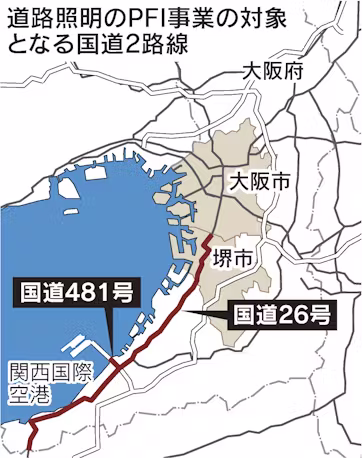 PFI事業は国道26号の大和川以南と関西国際空港近くの国道481号の計50キロメートルが対象で、25年度中に事業者を決める。26年度末までに、堺市中心部の「フェニックス通り」の一部などにあるダイダイ色の高圧ナトリウム灯1592灯が、消費電力が少ない白色のLED照明に変わる予定だ。