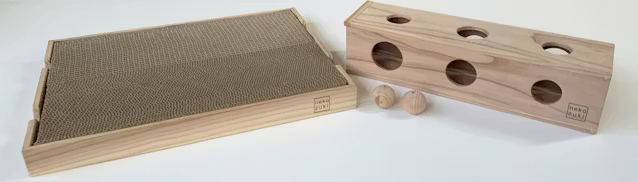 猫用おもちゃは穴の開いた木の直方体とボールを組み合わせた商品。爪とぎは消耗品の段ボールを固定するフレームを被災木で作った。木材には産地証明を付ける。販売価格はそれぞれ1万円弱になる見込みだ。
