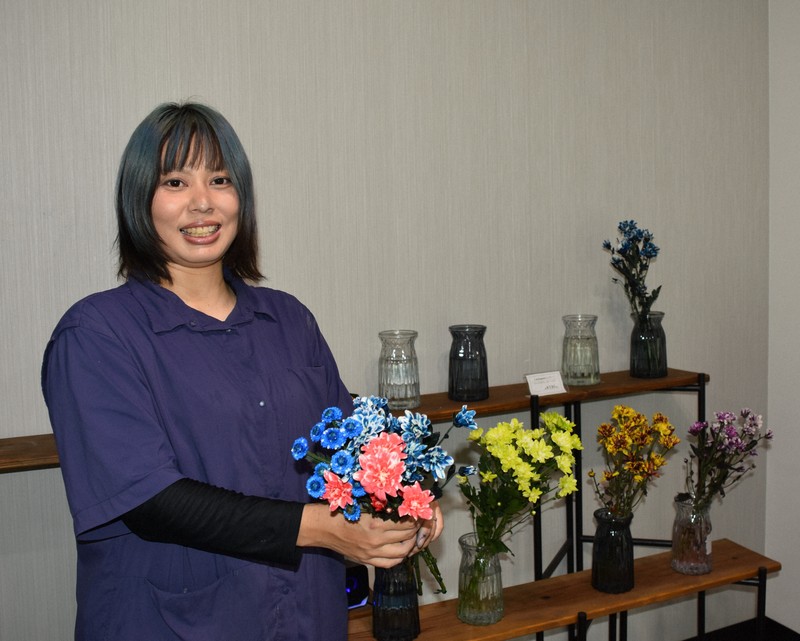 白い菊が、青やピンクに染まる。染料を混ぜた水を吸わせて花を色づける「カラーリングマム(染め菊)」を手がける佐賀県唐津市の千喜田樹理さん(37)は、アニメや漫画が大好きな「オタク女子」。美しい色合いは「『推し活』のアイテムになる!」と直感し、染め菊を販売する「千紫万紅(せんしばんこう)」を設立した。
