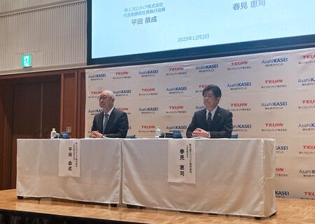 帝人と旭化成がそれぞれ傘下に持つ繊維商社、帝人フロンティア(大阪市)と旭化成アドバンス(東京)は2日、都内で経営統合に関する記者会見を開いた。帝人フロンティアの平田恭成社長は「事業領域の拡大、グローバル展開加速の必要性が高まっている」と統合の理由を説明。合算で現行計約4400億円の連結売上高を、2030年ごろに5000億円規模に伸ばす方針を示した。