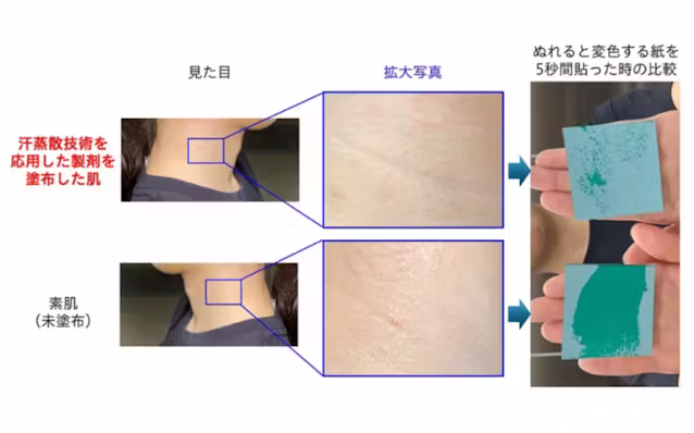 肌に見立てた人工皮革を用いた検証実験では、プロトタイプの製剤を人工皮革に塗布し、その上に人工汗を噴霧して蒸散するまでの時間を測定した。セ氏30度湿度60パーセントの暑熱環境下で人工汗が60パーセント蒸散する時間を測定した結果、未塗布に比べて蒸散時間が約33パーセント短くなることを確認した。