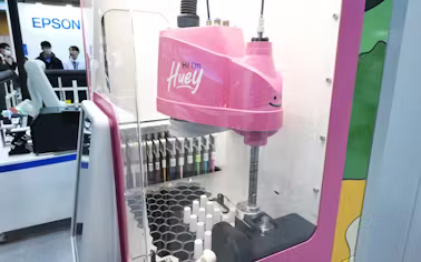 3日に東京都内で始まった「2025国際ロボット展」で、マニキュア調合ロボ自販機「ヒューイ」を初展示した。化粧品販売の米ブランクビューティーと共同開発した。エプソン製の水平多関節ロボット(スカラロボット)が搭載されている。
