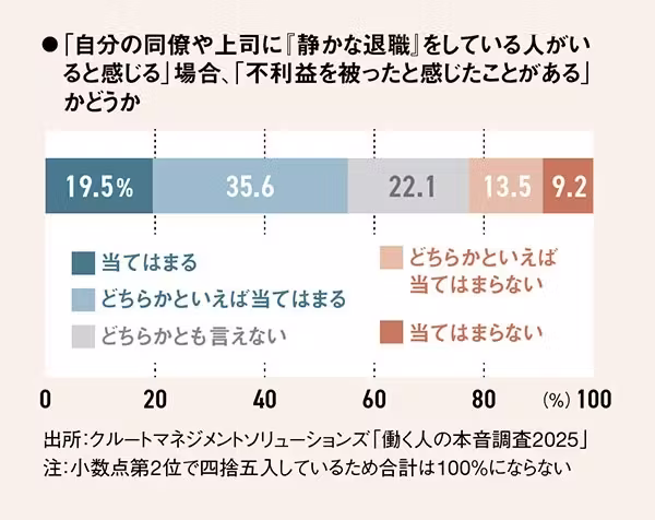 リクルートマネジメントソリューションズ(東京・港)が静かな退職に関する分析を進めており、25年9月には調査結果(「働く人の本音調査2025」)を公表している。これによれば、「自分の同僚や上司に『静かな退職』をしている人がいると感じる」回答者の割合は「当てはまる」「どちらかといえば当てはまる」を合わせると27.7%となり、4人に1人が職場でその存在を感じていることが分かった。