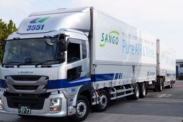 物流を手掛けるユーネットランス(愛知県豊田市)と協業し、15日から荷物の輸送で運用する。ダブル連結トラックは2つのコンテナを連結させて1人の運転手で荷物を運べる。導入で輸送費用は約9%、CO2排出量は10%削減できるという。