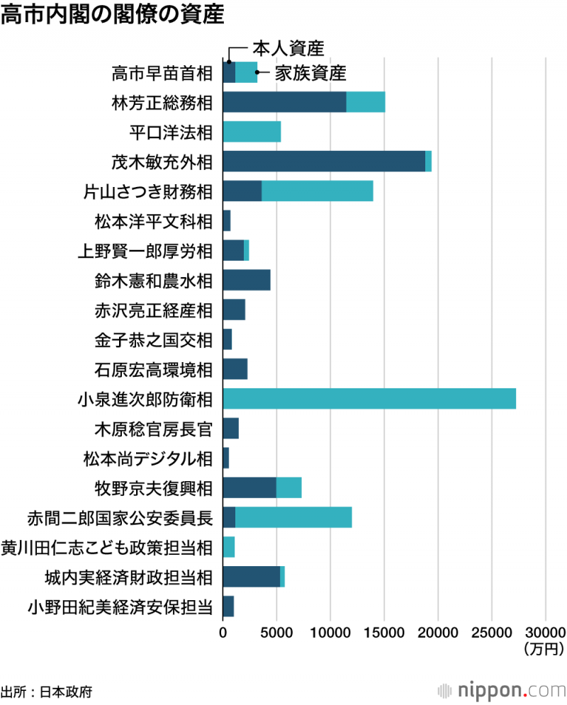 政府は高市早苗首相と18人の閣僚の政権発足時の資産を公開した。家族分を含めた資産総額の平均は6641万円だった。