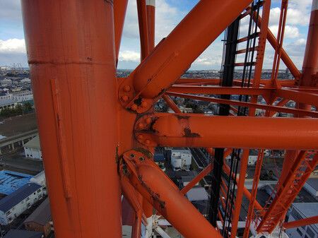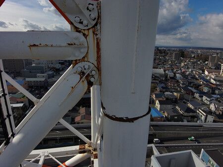 損傷した、NTT青森八戸ビルに設置されている鉄塔の柱(NTT東日本提供)