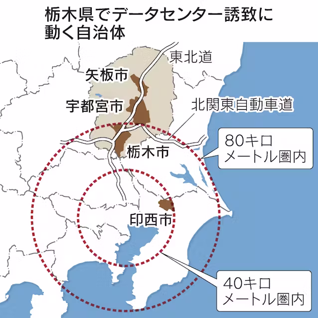 距離による通信遅延の問題で、データセンターは千葉県印西市周辺など都市近郊に集中している。地域分散の必要や通信技術の発展で、栃木県内では栃木市の産業団地にNTTグループが進出を決めた。矢板市も事業者誘致で名乗りを上げている。北関東が空白地から一転、集積地の候補として浮上してきた。