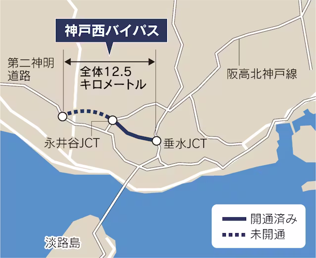 神戸西バイパスは西日本高速道路と事業を進めている第二神明道路のバイパスで、垂水ジャンクション(JCT)―永井谷JCTは整備済み。西寄りの区間を建設中だが、開通時期は未定。地盤が脆弱な場所で新たな橋が必要になったほか、基礎の止水対策の追加などが影響した。