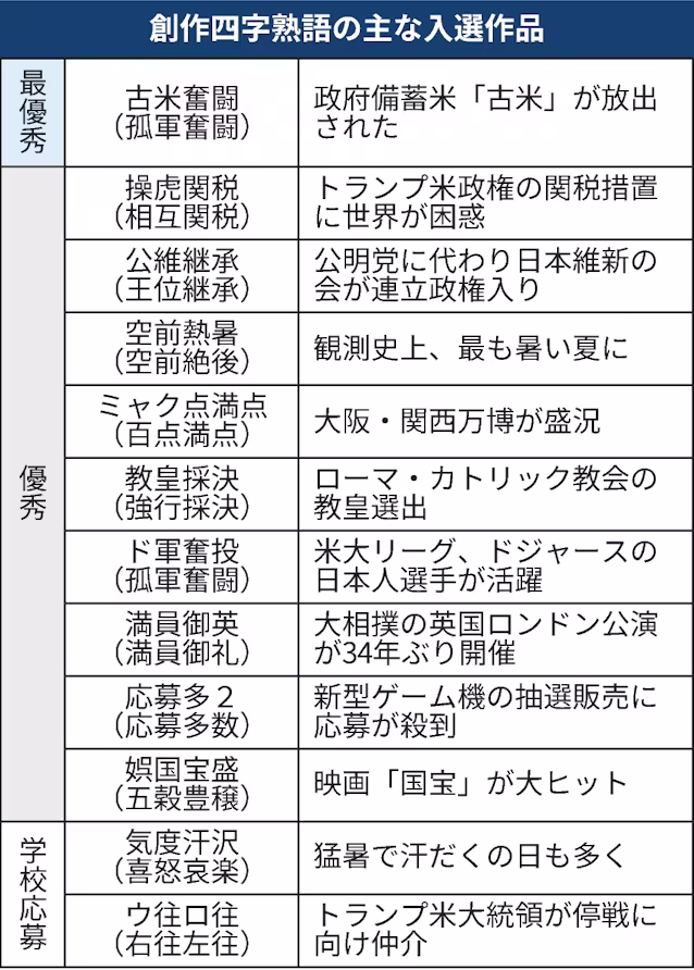 優秀作には大阪・関西万博の盛況を公式キャラクターの「ミャクミャク」になぞらえた「ミャク点満点」(百点満点)、トランプ米政権の関税措置に伴う混乱を表した「操虎関税」(相互関税)などが選ばれた。任天堂の新型ゲーム機「Nintendo Switch 2」の抽選販売に応募が殺到したことを受けた「応募多2」(応募多数)も入った。