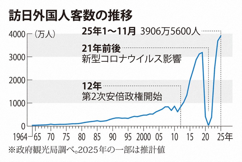 これまでインバウンドを巡っては第2次安倍晋三政権のもと「2020年4000万人」の目標を掲げ、18年に3000万人を突破するなど順調に増加したが、20年以降の世界的な新型コロナウイルスの感染拡大の影響で21年は24万人台まで激減。その後、コロナ禍の収束などにより、24年はコロナ前を超える約3600万人となった。