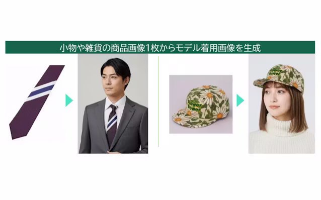 新サービスでは、従来のモデル撮影では採算が合わなかった少量生産品や小物、雑貨の着用画像を安価かつ高速に作成できる。生成する画像のモデルの身長・体重・年齢、人種・性別などの属性情報やポーズ、背景を自由に設定することが可能だ。既存の商品画像1枚から生成でき、即日納品にも対応する。