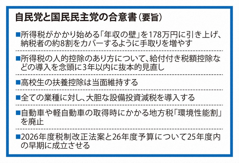 さらに両党は、自動車や軽自動車の取得時にかかる自動車税の「環境性能割」を廃止することも一致。政府・与党は当初、2年間停止にする方針だったが、廃止を求める国民民主の主張を受け入れた。首相は「負担を軽減、簡素化するため思い切って廃止することにした」と述べた。減収となる地方税約1900億円分については安定財源を確保するための具体的な方策を検討し、それまでの間は国の責任で手当てするとした。【井口彩、安部志帆子、鈴木悟、妹尾直道、原諒馬】
