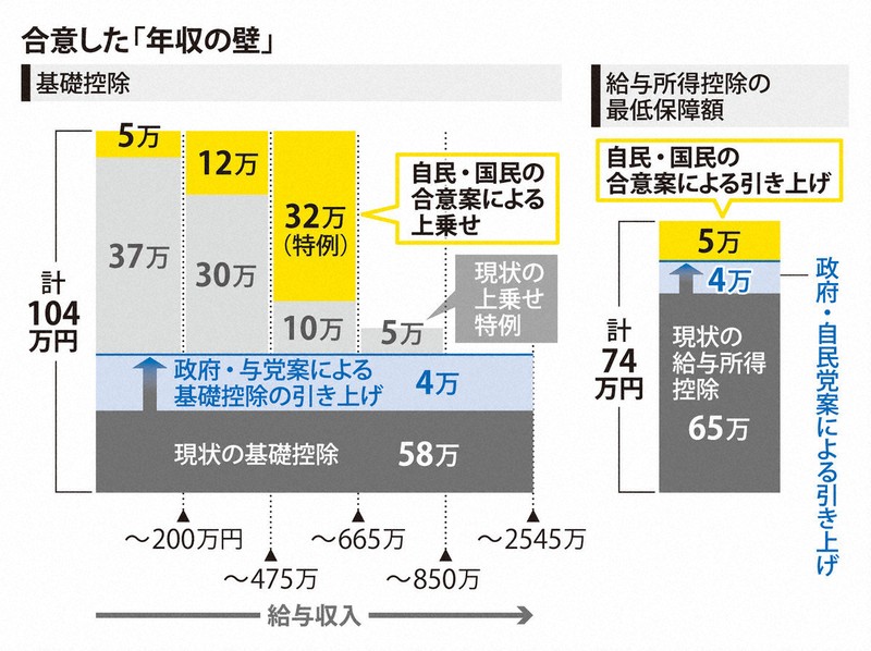 そのうえで26、27年に限り、基礎控除を最大限受けられる層を現行の年収200万円以下から年収665万円以下の層に広げて一律104万まで円引き上げ、さらに給与所得控除の最低額も5万円上げることで、合計178万円になるように設計した。