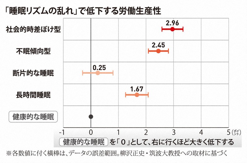 社会人の「睡眠リズムの乱れ」による日本全体の経済損失は、少なくとも年間1兆円規模――。睡眠ゲームアプリの国内利用者約8万人の記録から、世界的睡眠学者の柳沢正史・筑波大教授らの研究チームが推計したところ、平日と休日の睡眠リズムのずれ「社会的時差ぼけ」によって、労働生産性が著しく低下することが明らかになった。