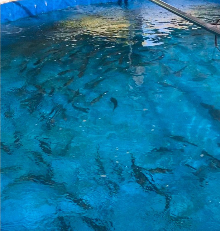 試験養殖が順調に推移したことを受け、25年4月、愛媛県西条市の県漁業協同組合ひうち支所と連携し、同市内でサーモンの陸上養殖を始めた。支所敷地内にいけす(直径5メートル、深さ1・5メートル)を13基設け、「うちぬき」と呼ばれる豊富な地下水を使って稚魚約4750匹を育ててきた。