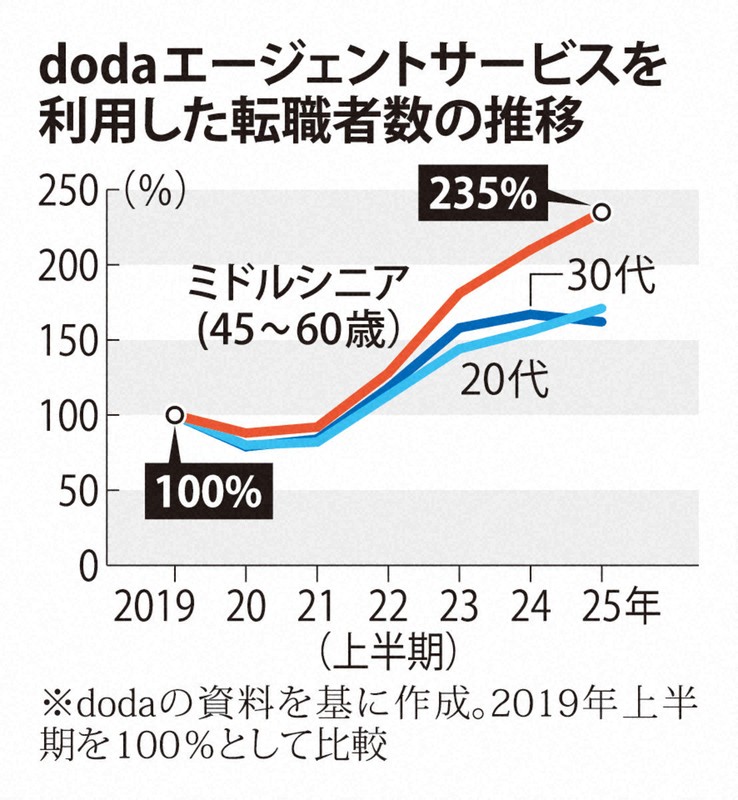 リポート「ミドルシニアの転職市場予測」によると25年上期、「デューダ」に新規登録した45~60歳の人は、19年同期比で1・6倍に増加。実際に転職が決まった人についても同期比で2・3倍に拡大した。