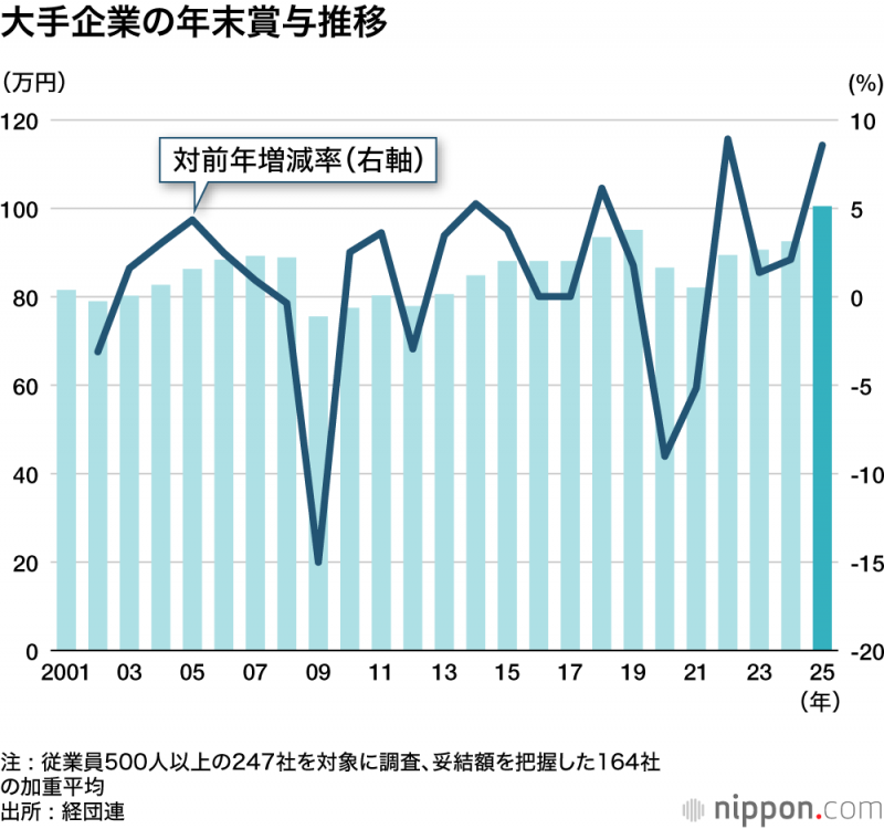 経団連が12月24日発表した大手企業の年末賞与妥結結果は、平均額が前年比8.57%アップの100万4841円で、4年連続で増加した。妥結額は比較可能な1981年以降で初の100万円超えとなった。