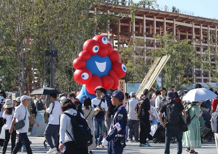 大阪・関西万博の公式キャラクター「ミャクミャク」像の前に集まる来場者ら=10月7日、大阪市此花区
