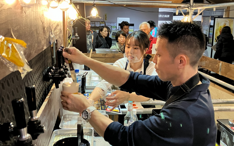 八幡西区役所での角打ちは酒販店が出張して生ビールを提供している(北九州市)