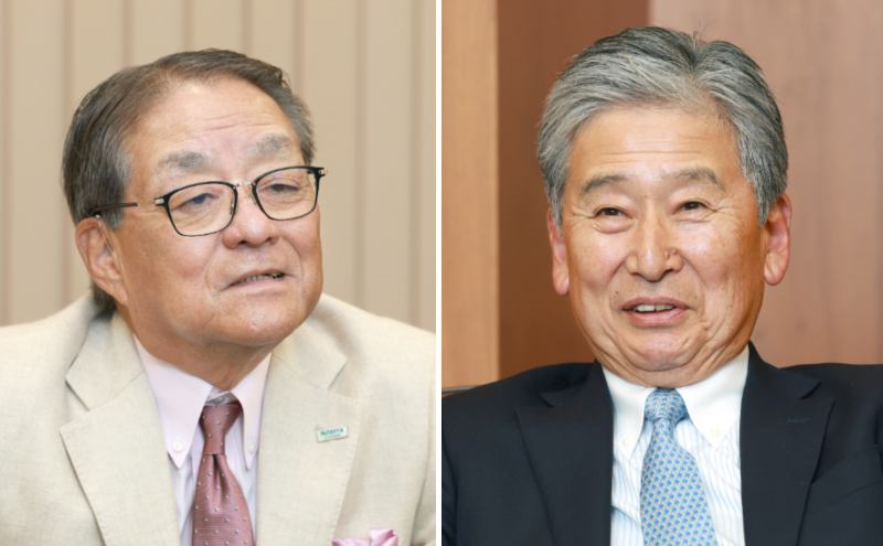 日本特殊陶業の尾堂真一会長㊧と、日本ガイシの大島卓会長