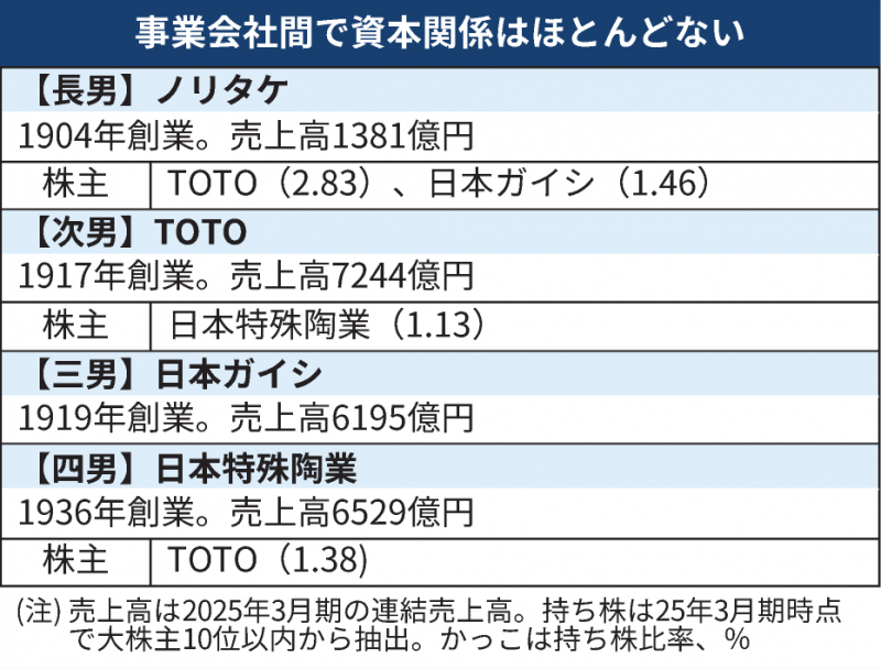 セラミックス企業の集団「森村グループ」は上場する事業4社について、ノリタケを長男にTOTO、日本ガイシ、日本特殊陶業の順で兄弟のように呼び合う。かつて一部の経営統合を模索したが実現せず、株の持ち合いや資本関係はほとんどない緩やかな連携が続く。…続きを読む