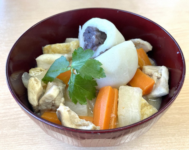 販売するのは、あん餅雑煮(720円)▽年明けうどん(1280円)▽あん餅雑煮うどん(820円)――の3種類。あん餅雑煮は白みそ仕立てのだしにあんこ入りの丸餅が特徴。具も香川の郷土料理「しっぽくうどん」に用いられるニンジンや油揚げなどをあしらった。