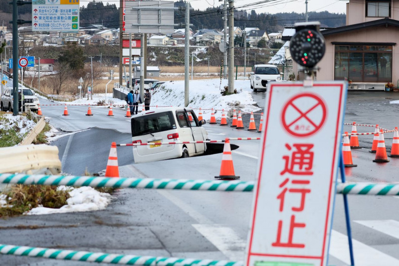 地震の影響で陥没した道路と落下した車両 (青森県東北町、時事)