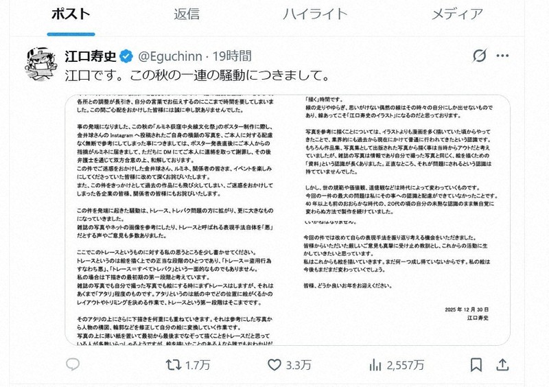 A 江口さんは「何を元に描いても『江口寿史の絵』になっていればいいのだという驕(おご)りも生まれていたのかもしれません」と反省し、「弁護士を通じて双方合意の上、和解しております」と説明しています。