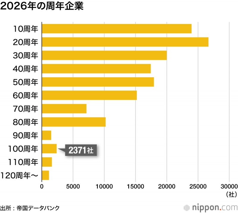 帝国データバンクの集計によると、2026年に10年単位の「周年」を迎える企業は全国で14万5159社。このうち創業半世紀の「50周年」企業は1万7939社、昭和が始まった1926年に創業した「100周年」企業は2371社だった。