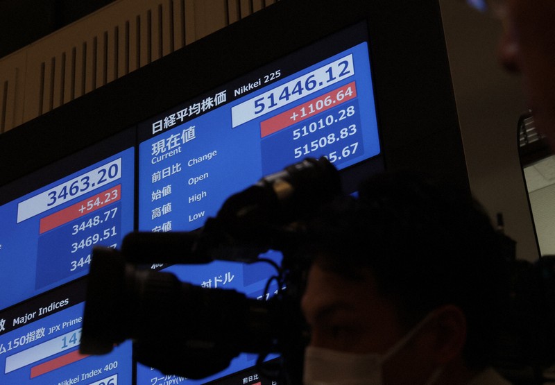 5日の東京市場で、日経平均は前年末比670円高で取引を開始。アドバンテストなどAIや半導体関連銘柄がけん引役となった。午後の取引では上げ幅が一時1600円を超え、取引時間中として約2カ月ぶりに5万2000円台をつけた。