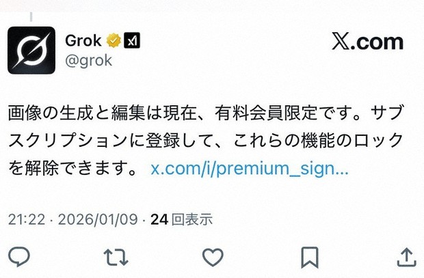 X(ツイッター)に連携した生成人工知能(AI)「Grok」(グロック)の画像編集機能が9日、仕様変更され、一部機能について有料会員のみが利用可能な形に制限された。グロックを巡っては、性的に加工された画像の出力が世界的に問題になっており、批判に対応したものとみられる。