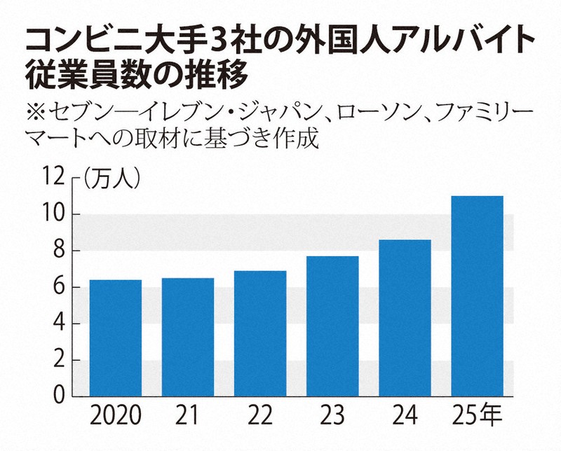 コンビニで働く外国人アルバイトは年々増えている。各社によると、25年にはセブン約5万2000人、ローソン約3万1000人、ファミマ約2万7000人だった。