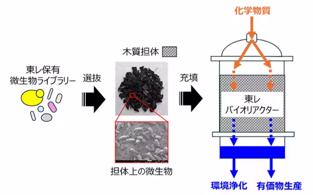 同技術では特定の微生物を木質の材料に付けてリアクター(反応装置)内に充塡する。化学物質を含む水溶液を反応装置に連続的に接触させることで、微生物の酵素により目的物質へ効率的に変換する。アクリロニトリルをモデルとした社内の実証試験では99.5%以上の変換率を確認した。