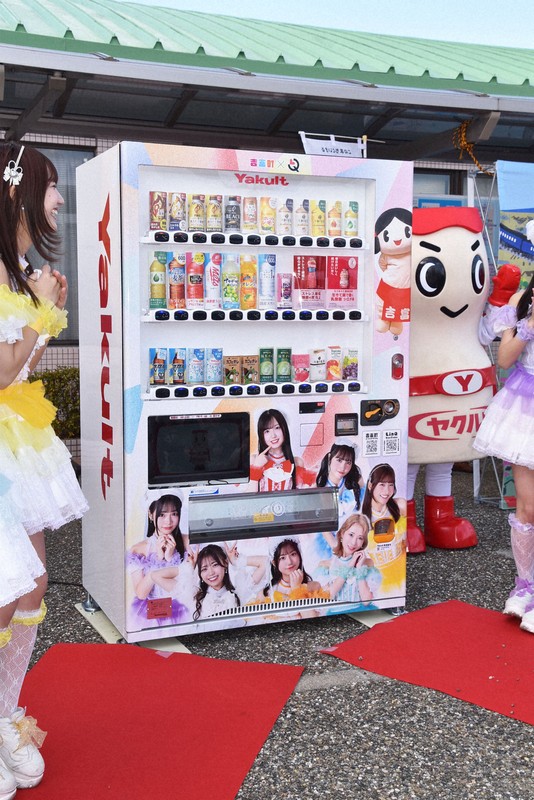 福岡県吉富町のJR吉富駅前に、町の観光PR動画をモニターに放映するラッピング自動販売機が登場した。21日にあったお披露目式で、ラッピングに登場する福岡拠点のアイドルグループ「LinQ(リンク)」のメンバー7人も駆けつけた。