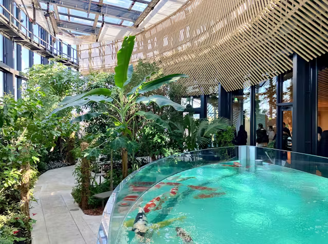 建築家の隈研吾氏が設計し、天井など随所に竹を使った。名称は「未来に向かって前進する船」をイメージし、「憩いの場」などの意味を込めたという。