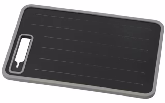 1枚で「解凍・切る・おろす・研ぐ」ができるまな板を改良した。新モデルでは「塊肉や魚一尾などの大きな冷凍食材も、より置きやすくしたい」という顧客の声に応じて、解凍プレート部分の面積を約20%広げた。熱伝導率の高いアルミニウム製プレートをそのまま採用し、より大きな冷凍食材を効率よく解凍できるようにした。