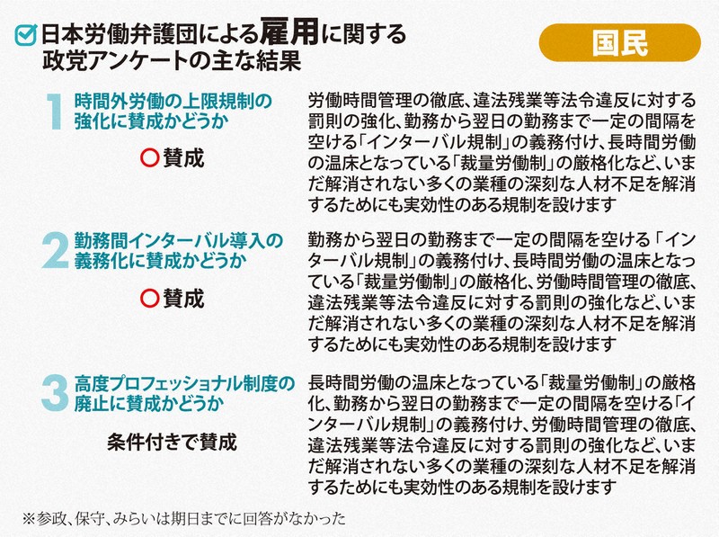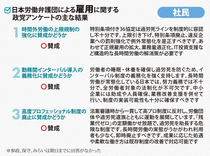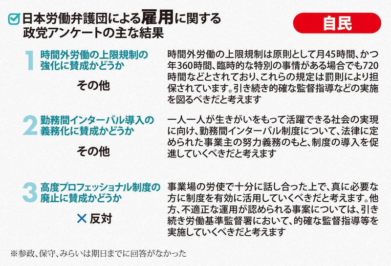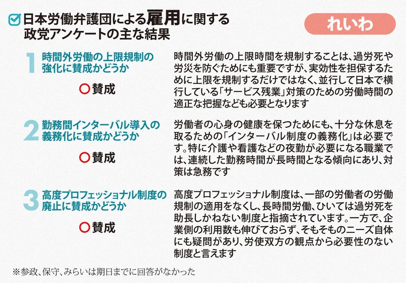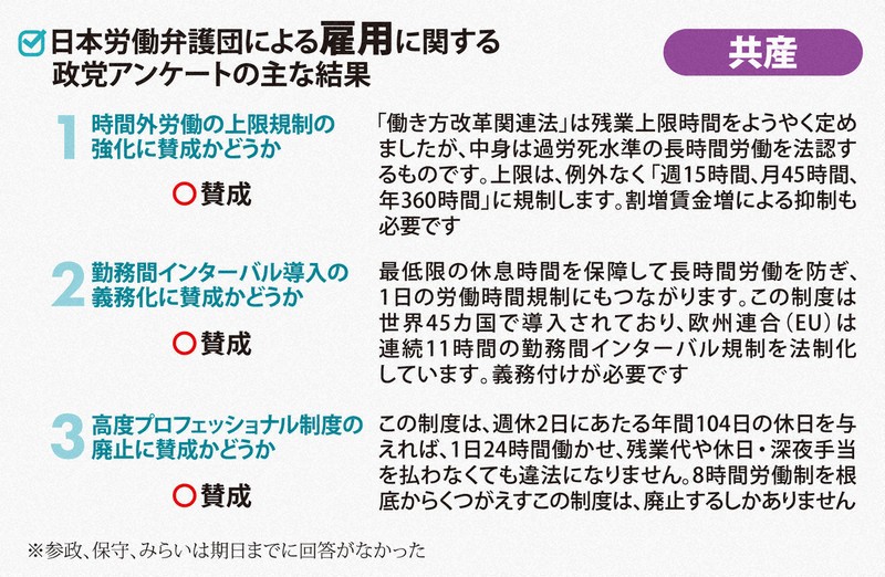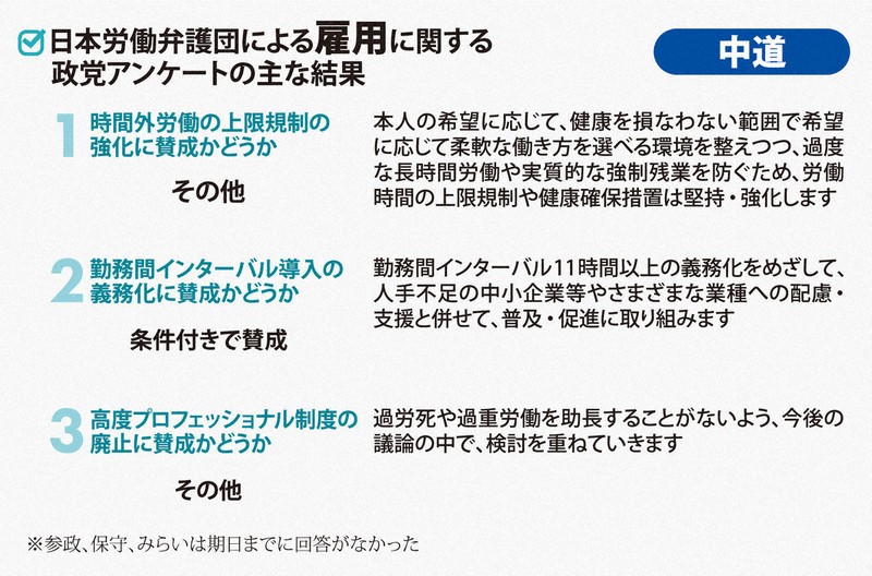 時間外労働の上限規制の強化では、維新、国民民主、共産、れいわ、社民が賛成。中道は「柔軟な働き方を選べる環境を整えつつ、上限規制は堅持・強化」とした。自民は「規定は罰則により担保されている。引き続き監督指導を図るべきだ」と述べるにとどまった。