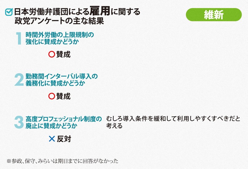 裁量労働制に似た仕組みの「高度プロフェッショナル制度(高プロ)」を巡っては意見が割れた。制度廃止に賛成が4党、反対が2党、その他が1党だった。反対の維新は「導入条件を緩和して利用しやすくすべきだ」と回答した。